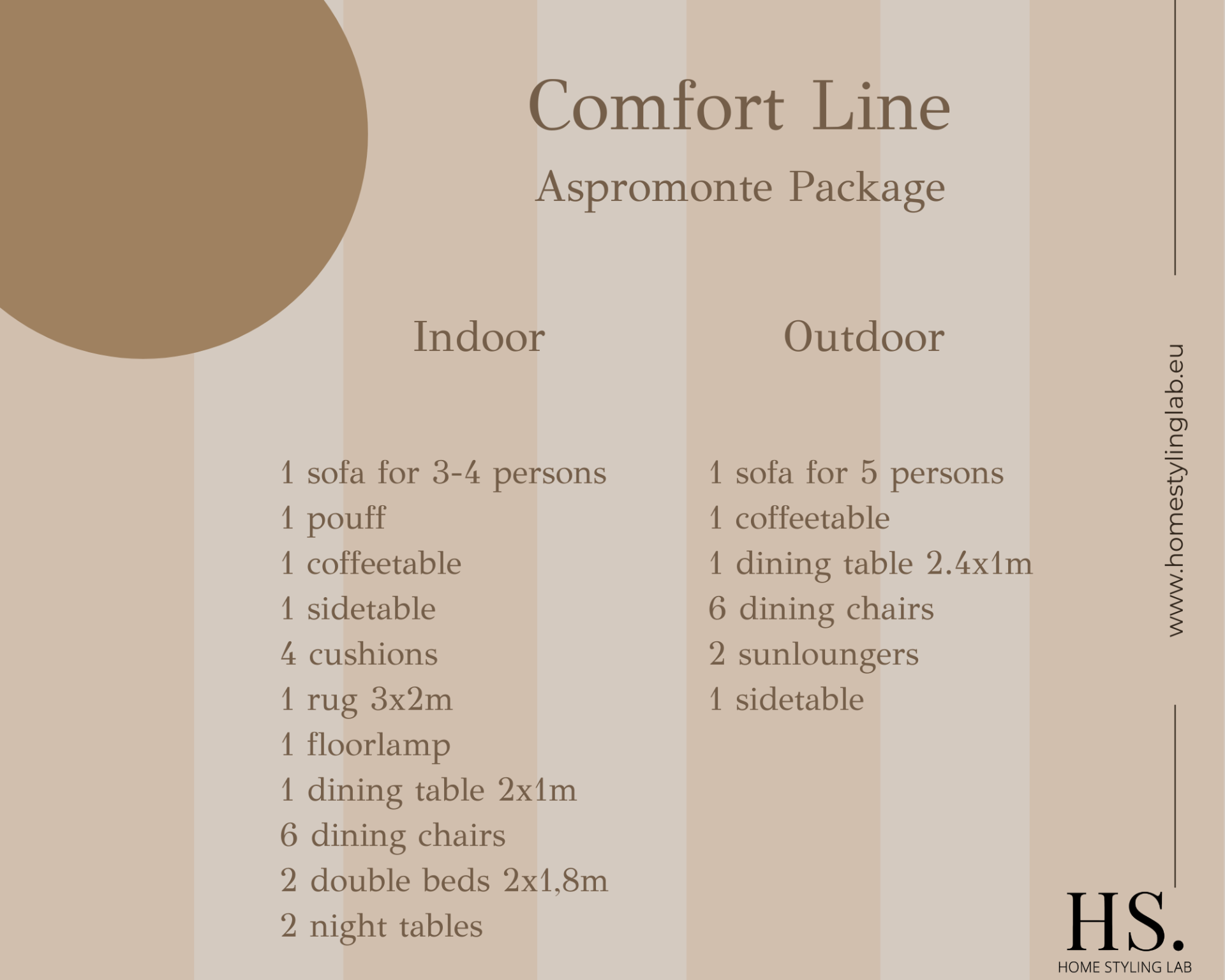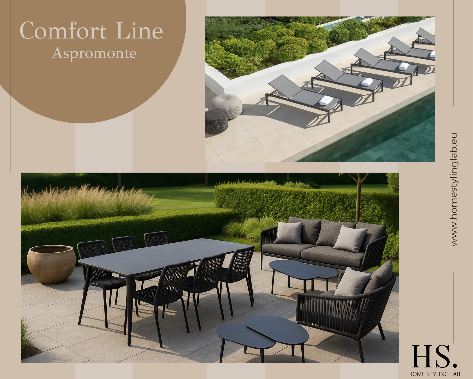 De Aspromonte lijn staat voor eigentijdse elegantie met strakke lijnen en koele grafiettinten. Buiten: stapelbare ligbedden, keramische eettafel en rope-loungeset op slanke frames. Binnen: organische hoeksofa, ovalen eiken tafel en zwarte accenten met terracotta kussens. Pakket optimaliseert verhuurwaarde en comfort, inclusief styling, levering en montage voor MijnHuisInTropea, met serviceplan en garantie inbegrepen.