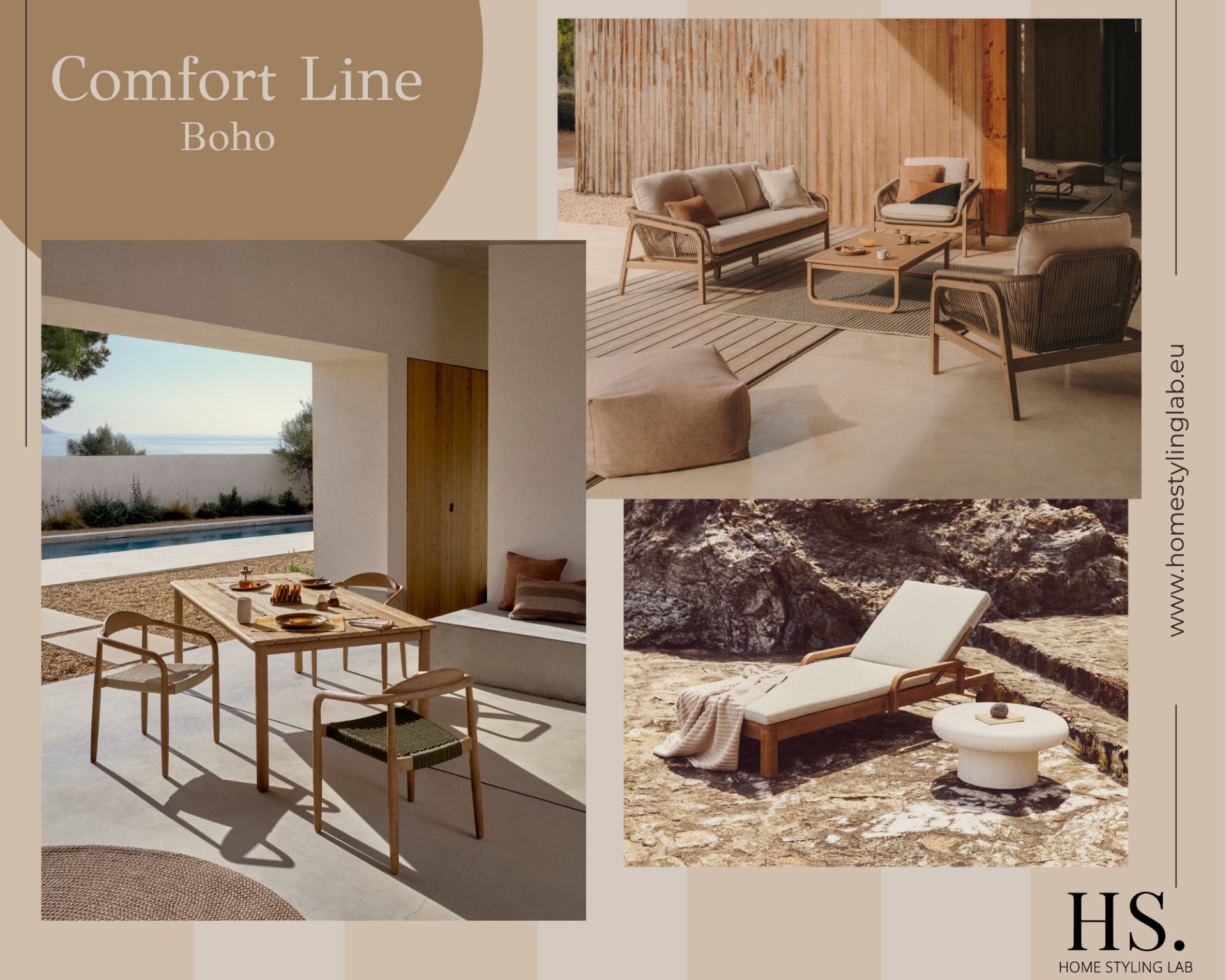 Comfort Boho brengt mediterrane nonchalance met natuurlijke materialen en warme, aardse tinten. Buiten: rope-loungeset, houten tafel met gevlochten stoelen en een comfortabel ligbed met bijzettafel. Binnen: luchtige modulaire sofa, walnoot eettafel, geweven texturen, zachte vloerkleden en een serene slaapkamer. Compleet pakket inclusief styling, levering, montage, serviceplan en garantie, met elegantie.