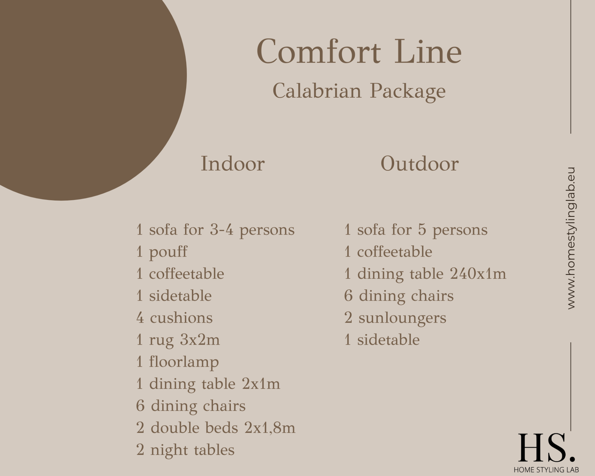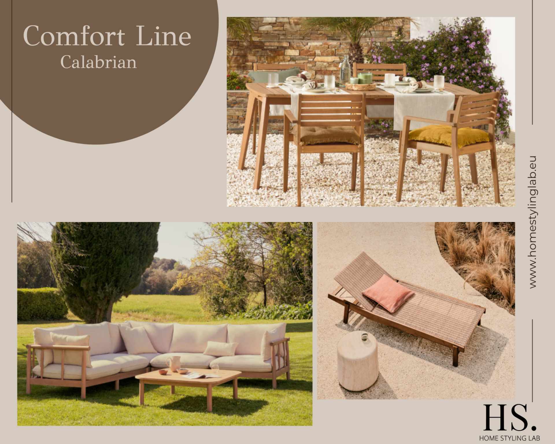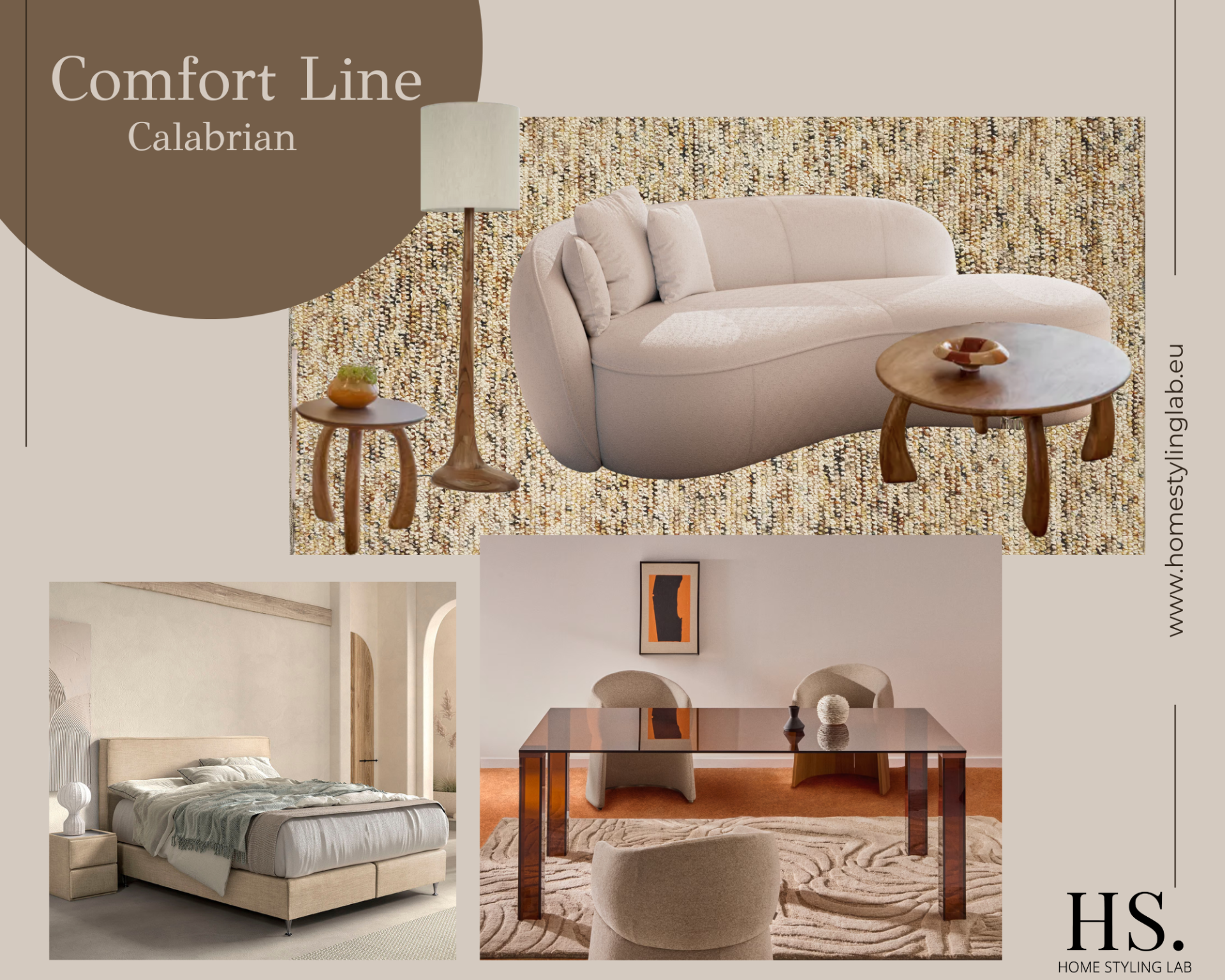 Comfort Calabrian combineert zachte mediterrane vormen met tijdloze materialen. Buiten: teakhouten eetset, loungehoek en ligbed in warme zandtinten. Binnen: afgeronde sofa, organische salontafels, serene slaapkamer en elegante eettafel met tactiele texturen. Een kant-en-klaar pakket voor rust, comfort en stijlvolle verhuurwaarde bij MijnHuisInTropea. Inclusief kleurenpalet, styling, levering en montage, serviceplan, garantie.