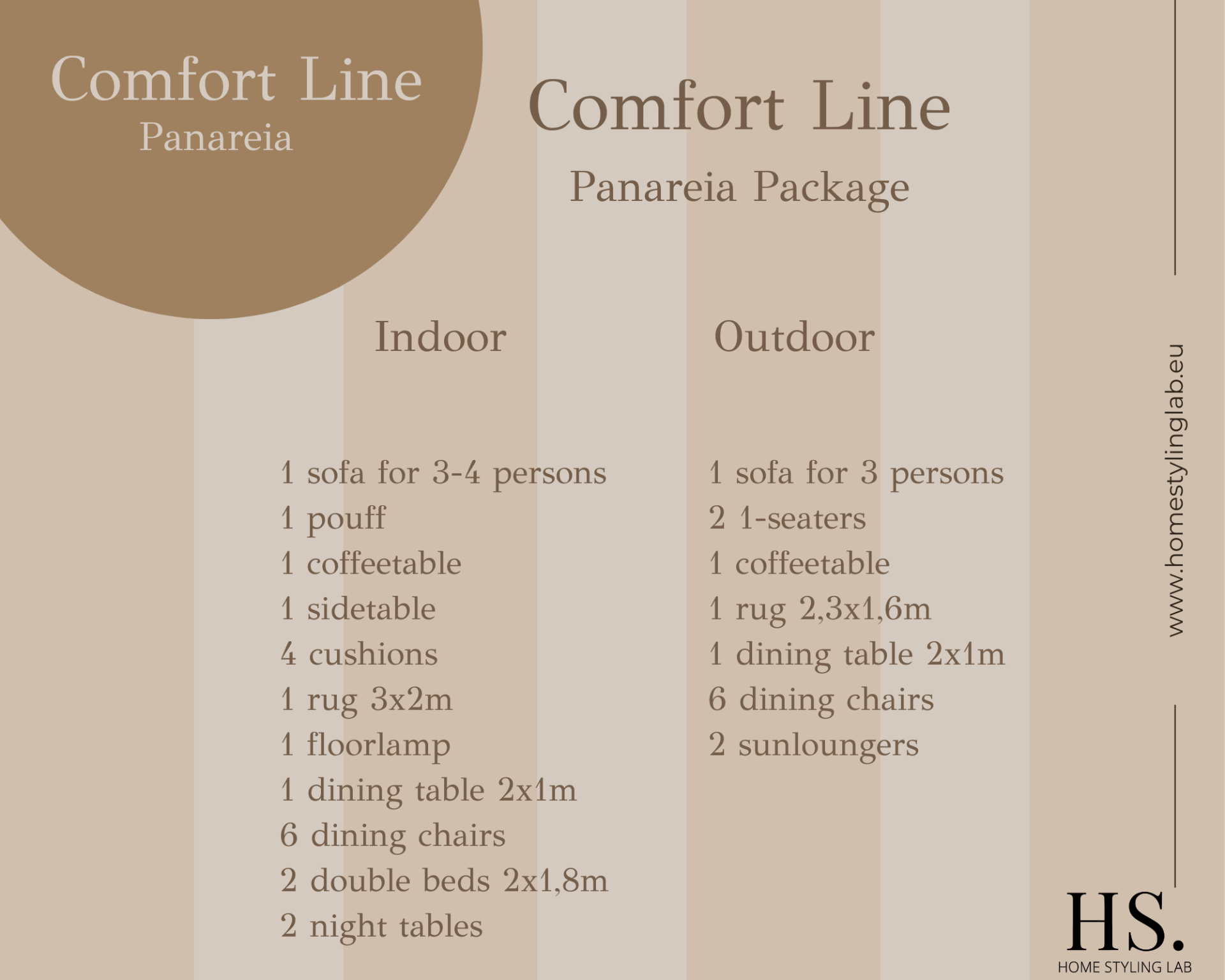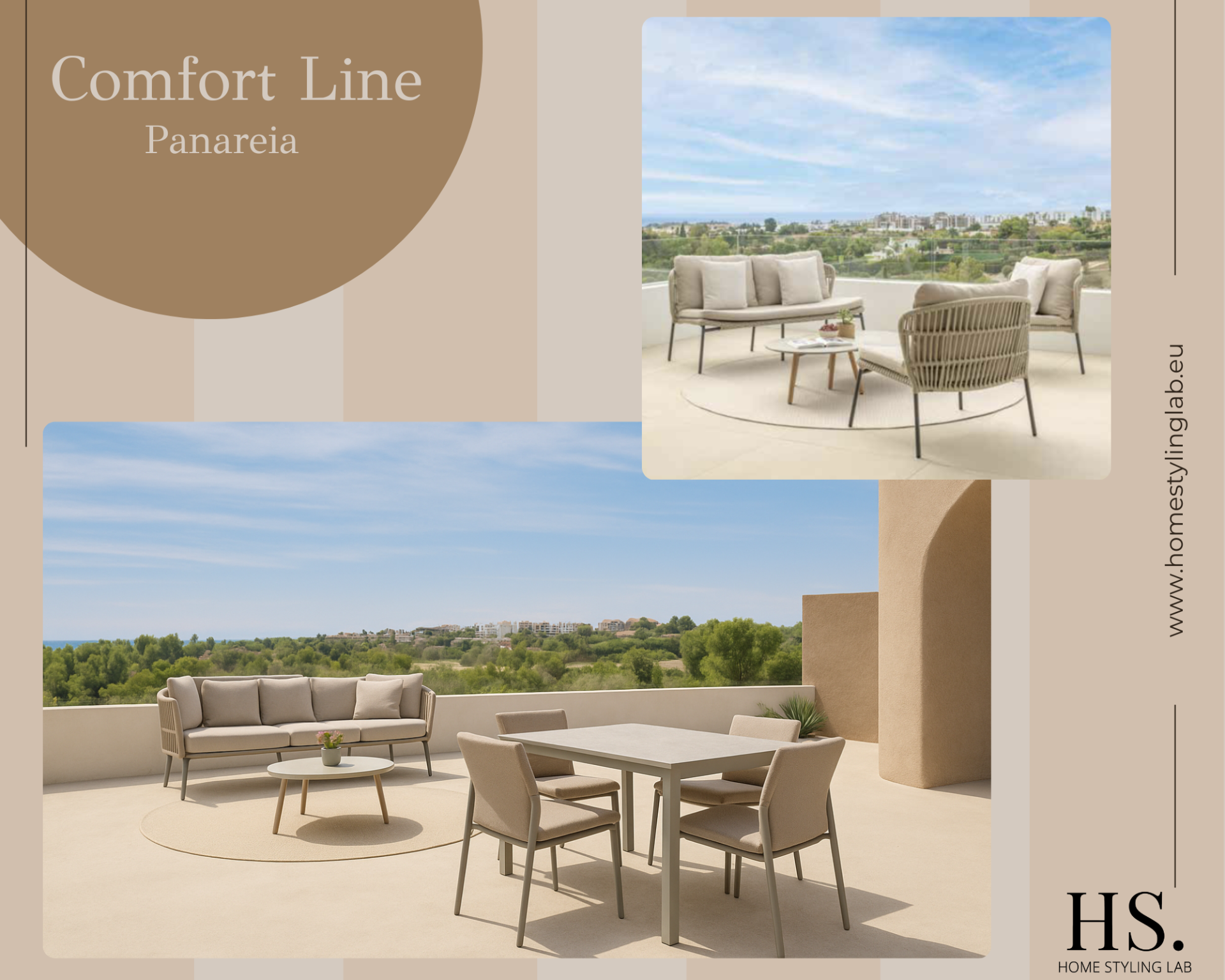 Comfort Calabrian combineert zachte mediterrane vormen met tijdloze materialen. Buiten: teakhouten eetset, loungehoek en ligbed in warme zandtinten. Binnen: afgeronde sofa, organische salontafels, serene slaapkamer en elegante eettafel met tactiele texturen. Een kant-en-klaar pakket voor rust, comfort en stijlvolle verhuurwaarde bij MijnHuisInTropea. Inclusief kleurenpalet, styling, levering en montage, serviceplan, garantie.
