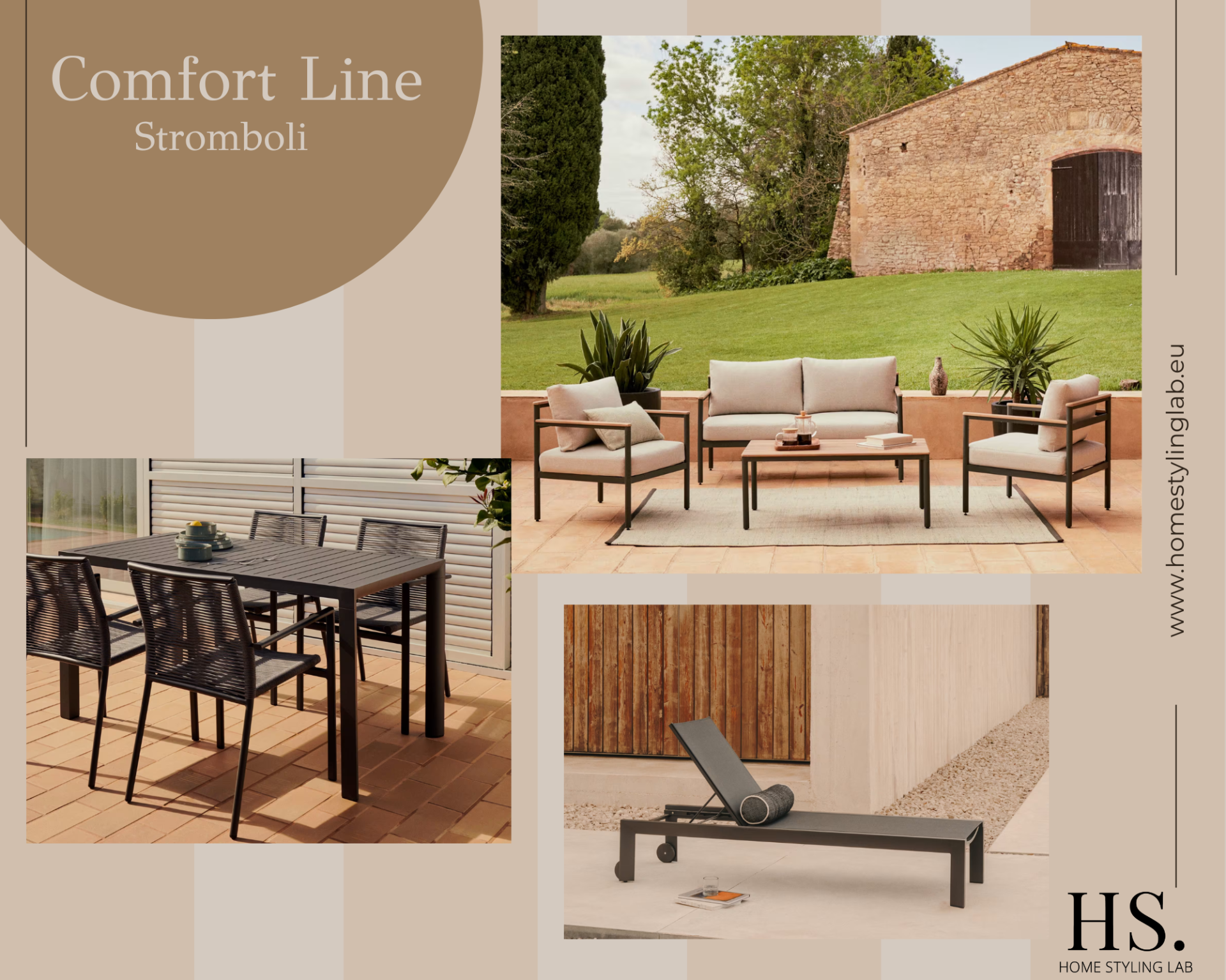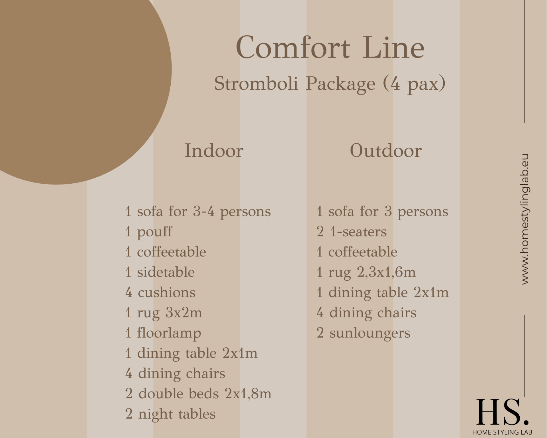 Comfort Stromboli is strak en robuust, met vulkanische nuances. Buiten: aluminium eetset, rope-loungeset en verstelbaar ligbed op zwarte frames. Binnen: kubistische modulaire sofa, ronde eettafel op pijlerpoten, glas/amber salontafel en rustige slaapkamer. Compleet turnkey pakket voor verhuur en gebruik: styling, levering, montage, serviceplan en garantie, duurzame materialen en onderhoudsgemak.